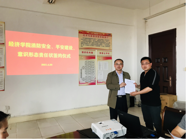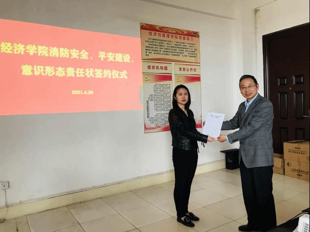 为加强学院意识形态工作建设、平安建设及消防安全管理工作,明确主体责任,保障学院安全稳定发展,4月20日下午,经济学院在义丰楼会议室举行beat365正版唯一官网必一2021年意识形态、消防安全、平安建设工作责任状签订仪式。会议由学院党委书记漆晗东主持。学院党委书记漆晗东、院长项益才与各科室、教研室负责人、支部书记层层签订了2021年度意识形态、消防安全、平安建设工作责任状。