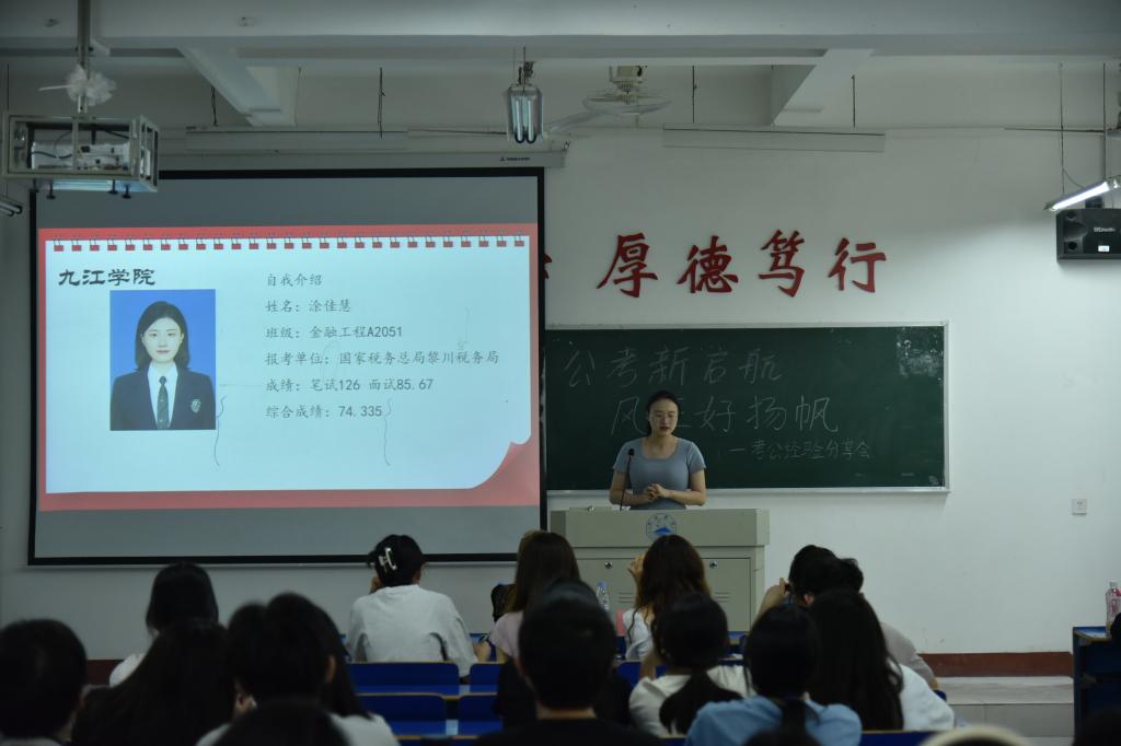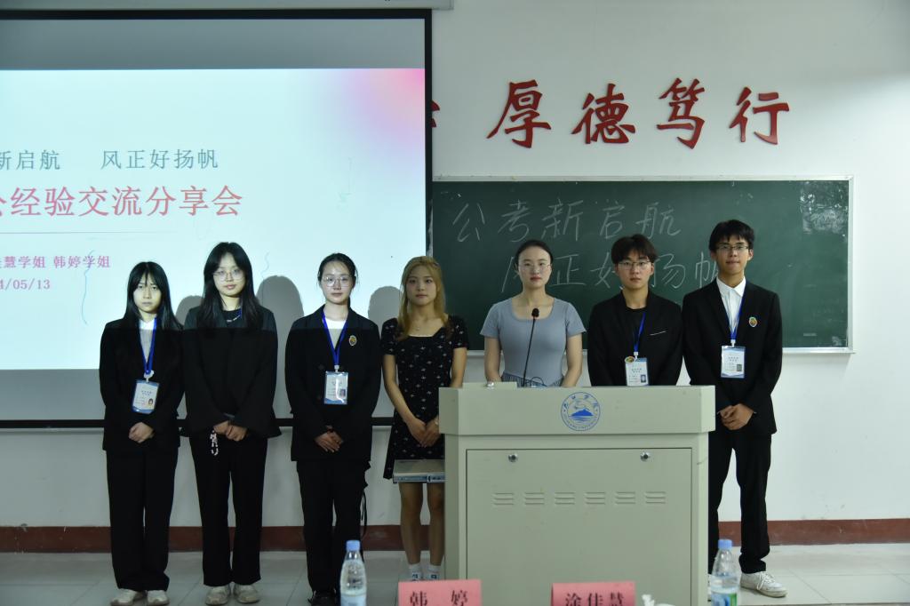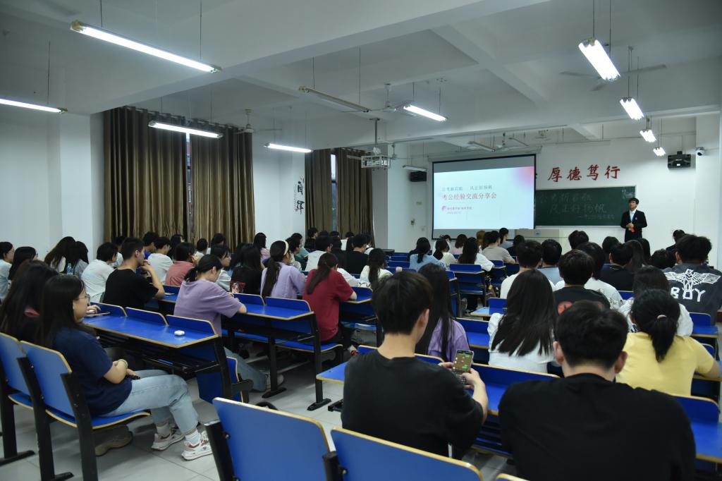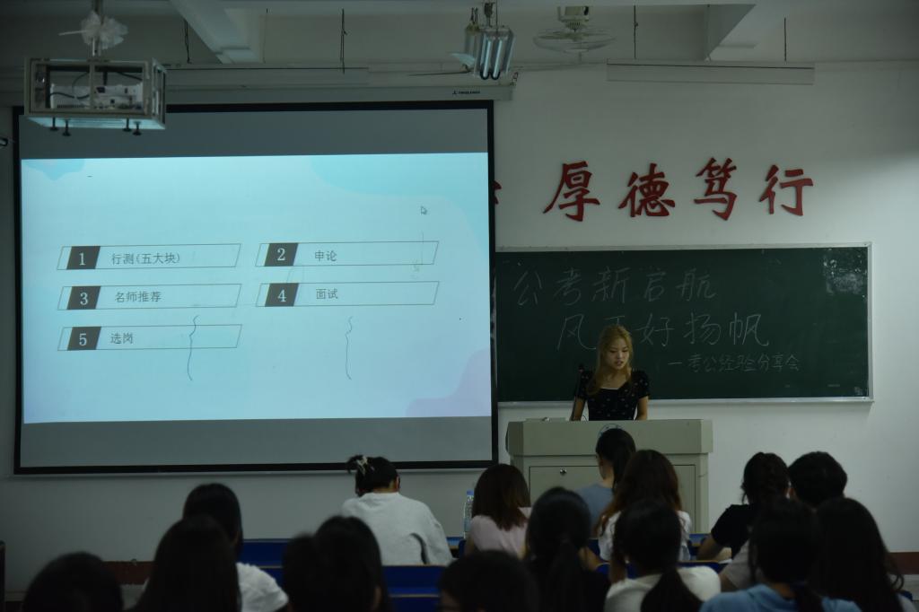 活动伊始,涂佳慧同学从公务员职业的现状出发,深入剖析了公务员职业的稳定性、发展前景以及良好的福利待遇。并系统全面地介绍了公务员报考时间、流程、内容等基本知识。
