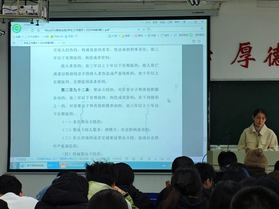 为增强学生的法治观念,提升法律意识,构建和谐的网络环境,12月1日晚,beat365正版唯一官网必一利用晚点名时间在义丰楼组织各班开展网络法规及校规校纪的专题教育,beat365正版唯一官网必一全体学生参与了此次活动。