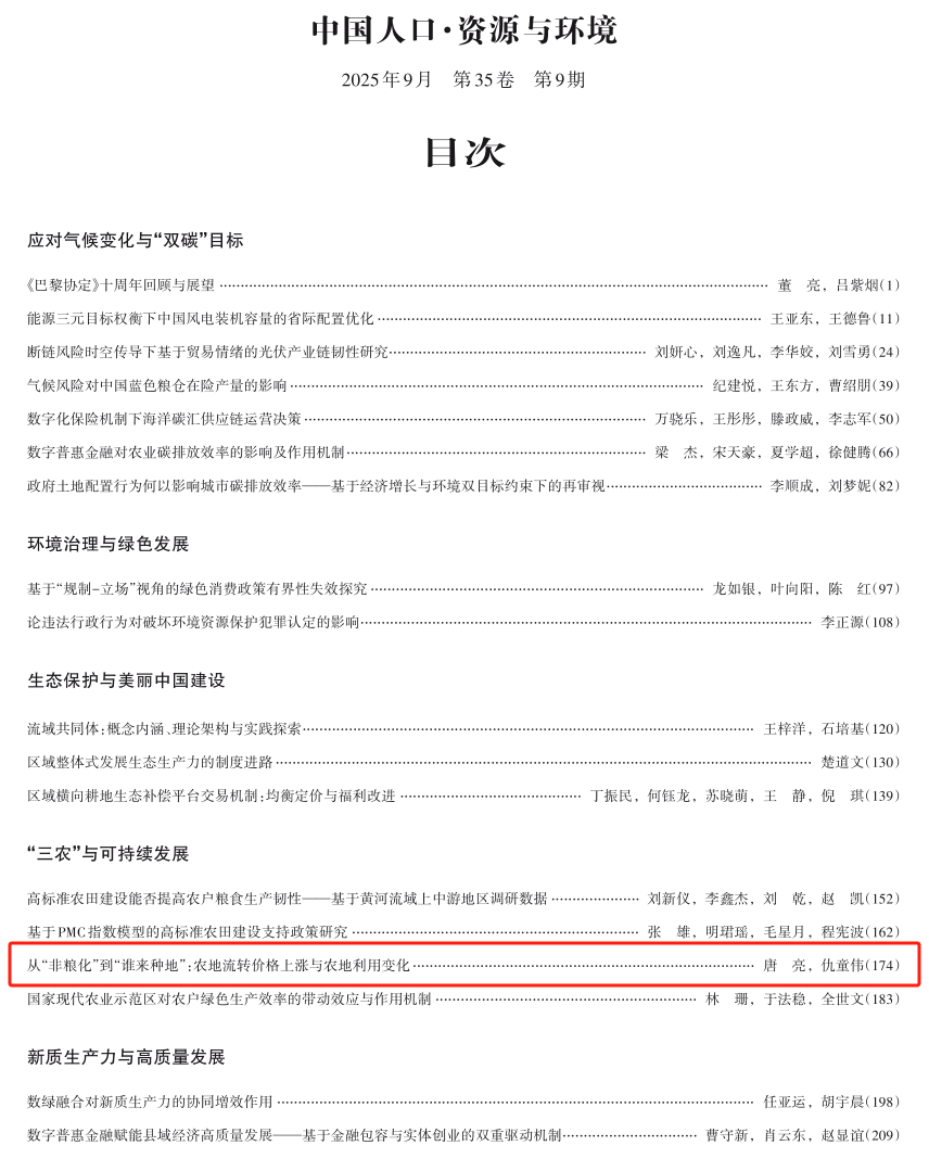 近日,威廉官网青年研究员唐亮博士关于农地流转价格与农地利用关系相关研究发表在《中国人口·资源与环境》。农地流转市场化是优化农地要素配置,发展农业新质生产力的重要路径。然而,农地流转价格过快且不合理上涨正在加快农业生产成本的增加,严重影响了农业可持续发展。该研究利用2015—2023年中国家庭金融调查村庄数据,考察了农地流转价格与农地利用的关系。研究结果表明,农地流转价格与农地“非粮化”整体上具有正相关关系,但二者也存在倒“U”形关系。其原因在于,农地流转价格与农地闲置比例存在“U”形关系,即在拐点后农地闲置比例开始提高。换言之,农地流转价格的上涨在最初阶段会促进农地“非粮化”,但在达到拐点后,流转价格的持续上涨将开始加剧农地闲置,并诱发“谁来种地”的紧迫问题。进一步证据显示,农地流转价格上涨正在损害农民的种粮积极性,即农民在流转价格上涨过程中会转出农地并在剩余农地上进行多元化种植。而且,农地流转价格与农村外出务工劳动力比例呈“U”形关系,这一现象的形成原因在于,在拐点之前,新型农业经营主体对农村劳动力的农业就业具有一定的带动作用,而在拐点之后,流转价格上涨引发的农地转入主体退出和农地闲置降低了本地农业雇工需求,从而迫使农村劳动力向非农产业转移。为应对农地流转价格过度上涨引发的系统性风险,应该统筹规划补贴政策、产品价格政策和要素价格政策,并加快建设政府主导型和战略后备型农业经营体系,着力培育保障国家粮食安全和重要农产品稳定安全供给的国家队,筑牢防范农地“非粮化”和“无人种地”的最后一道防线。