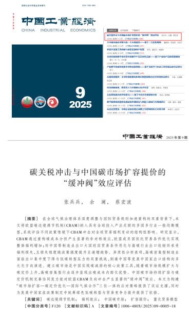 近日,威廉官网张兵兵教授团队合作论文《碳关税冲击与中国碳市场扩容提价的“缓冲阀”效应评估》在应用经济学和管理学类综合性权威理论期刊《中国工业经济》第9期首篇刊发。