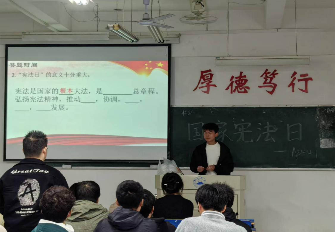 为增强同学们的宪法意识,大力弘扬宪法精神,营造尊崇宪法、学习宪法、维护宪法、践行宪法的浓厚氛围。12月1日,beat365正版唯一官网必一特在义丰楼开展以“弘扬宪法精神,共筑法制青春”为主题的团日活动。