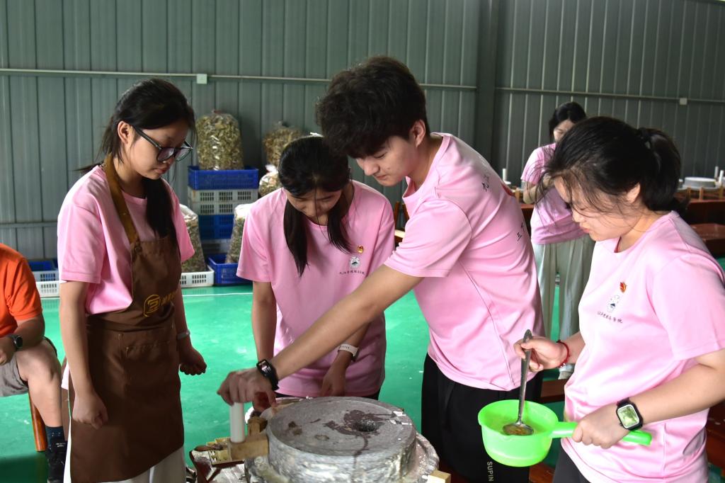 6月26日,实践队走进流芳乡开启非遗传承实践活动。上午,队员们运用各类豆类原料进行豆画拼接创作,将beat365正版唯一官网必一院徽、美好愿景等元素融入作品,感受民间智慧与传统技艺的创新融合。下午,队员们走进当地非遗工坊,亲身体验豆腐制作全过程,从挑选黄豆到石磨磨浆再到柴火灶煮浆点卤、压制成型,在豆香四溢中领悟古法技艺的匠心传承,探索非遗文化赋能乡村振兴的新路径。
