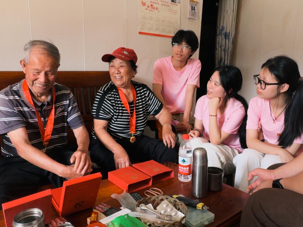 6月27日,团队走访慰问流芳乡老党员徐贤林、刘菊花夫妇。有着63年党龄的徐贤林同志讲述带领村民垦荒拓田、筑渠引水的奋斗历程,52年党龄的刘菊花同志分享担任生产队队长期间的实干经历。老党员夫妇展示“光荣在党50年”纪念章,并寄语青年学子珍惜当下、努力学习、为党和人民贡献力量。这次走访是一场跨越半世纪的精神对话,让红色基因在青年心中生根发芽,激励学子传承徐贤林、刘菊花夫妇“坚守初心、实干为民,不畏艰难、勇于担当”的精神!